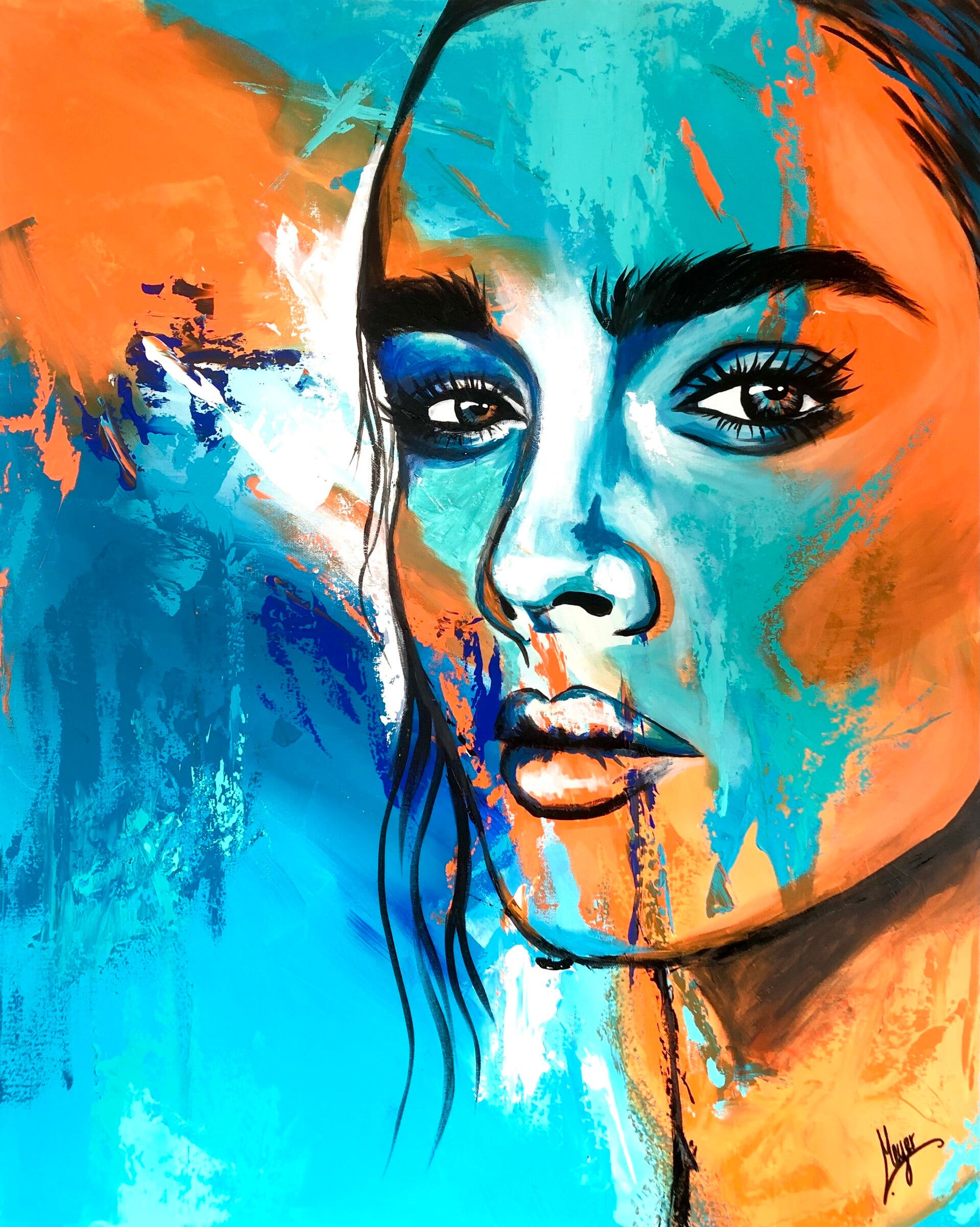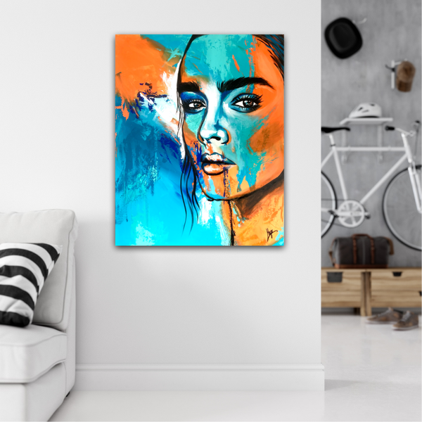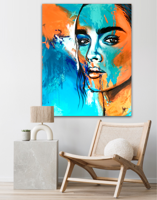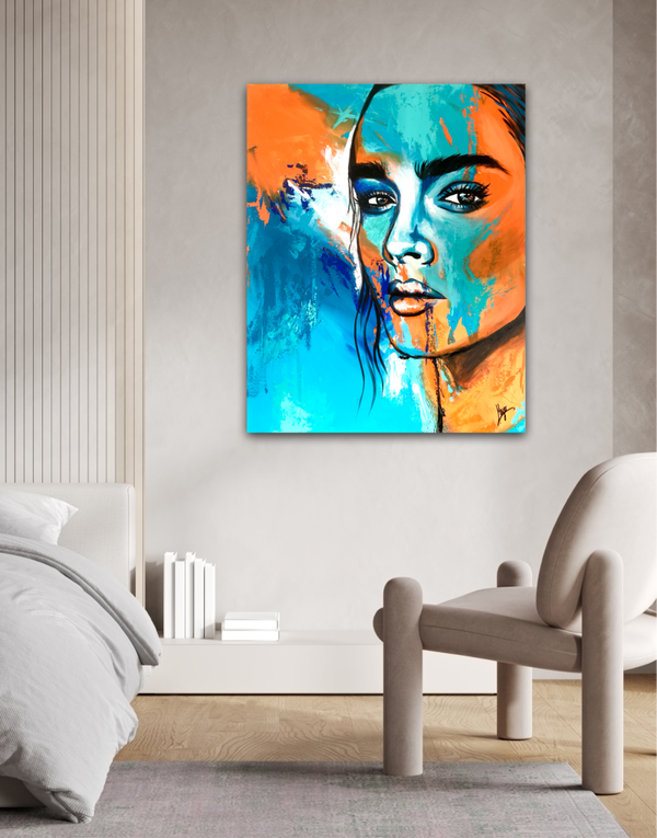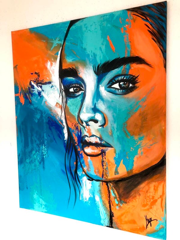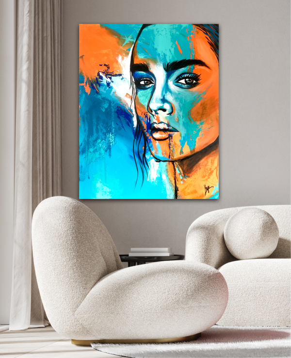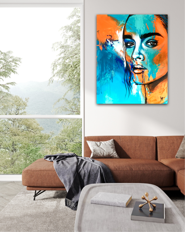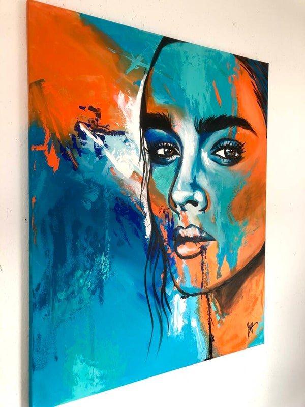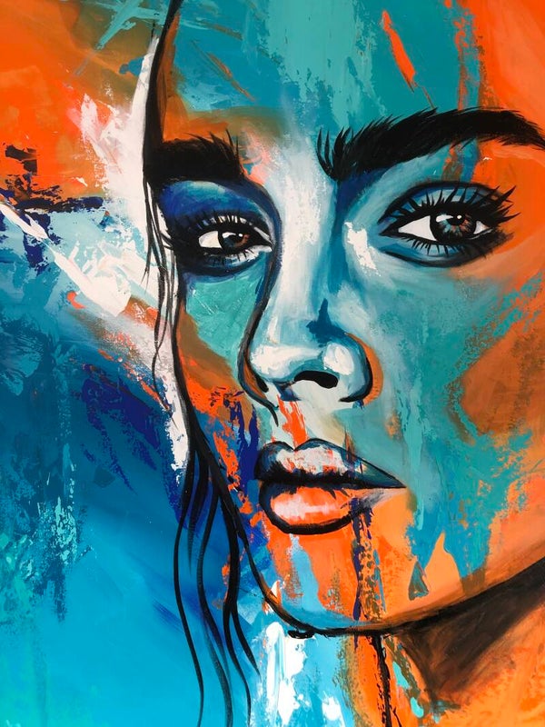 "Meet Me on the Other Side of Fear" ist das zweite Kunstwerk aus meiner Serie "Birth" und symbolisiert den Mut, sich den eigenen Ängsten zu stellen. In diesem Werk habe ich meine persönlichen Ängste verarbeitet und eine starke Frau dargestellt, die selbstbewusst ihren Ängsten entgegentritt, im Wissen, dass sie diese überwinden wird. Durch kühne, lebendige Schattierungen von Blau und Orange, gepaart mit dynamischen, expressiven Strichen, entsteht ein halb-abstraktes Porträt, das innere Stärke und Resilienz verkörpert. Dieses Gemälde lädt den Betrachter dazu ein, seine eigene Kraft zu erkennen und Mut zu fassen. Es bringt eine Botschaft der Hoffnung und Stärke in jeden Raum.