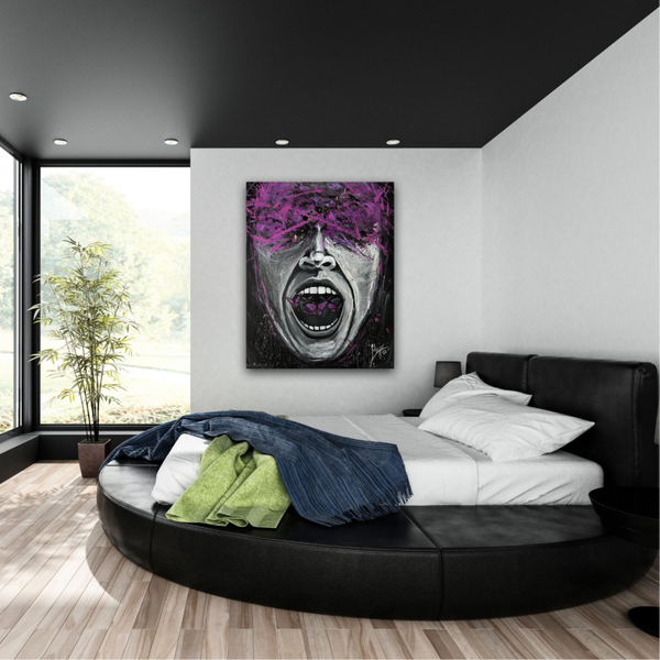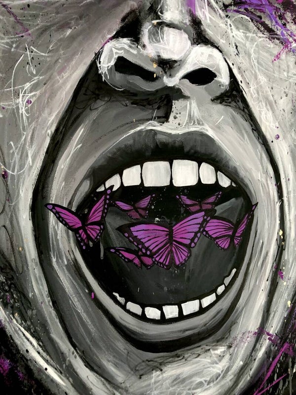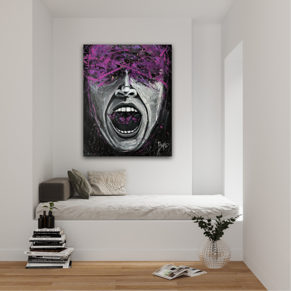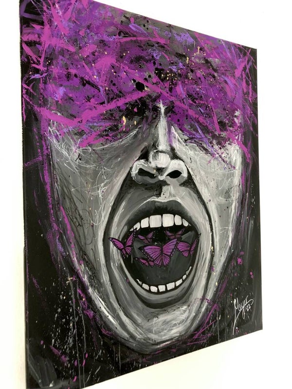 Den lila/flieder Ton des Kunstwerks habe ich selbst aus verschiedenen Pigmenten kreiert. Dadurch ist die Farbe einzigartige und besonders intensiv. Diese Farbe leuchtet unter der Bestrahlung von schwarz Licht.