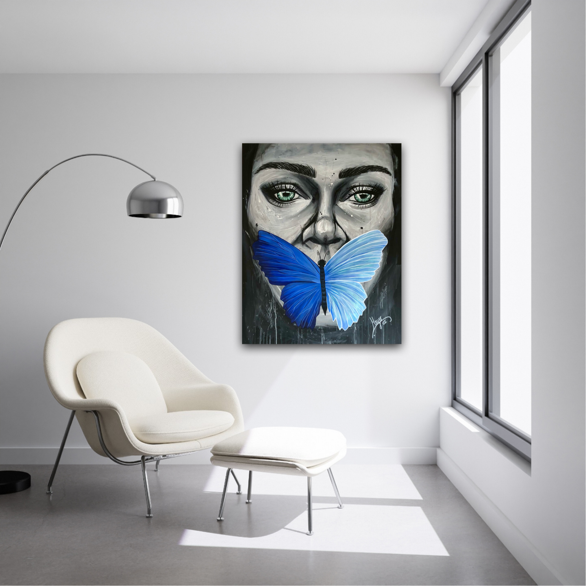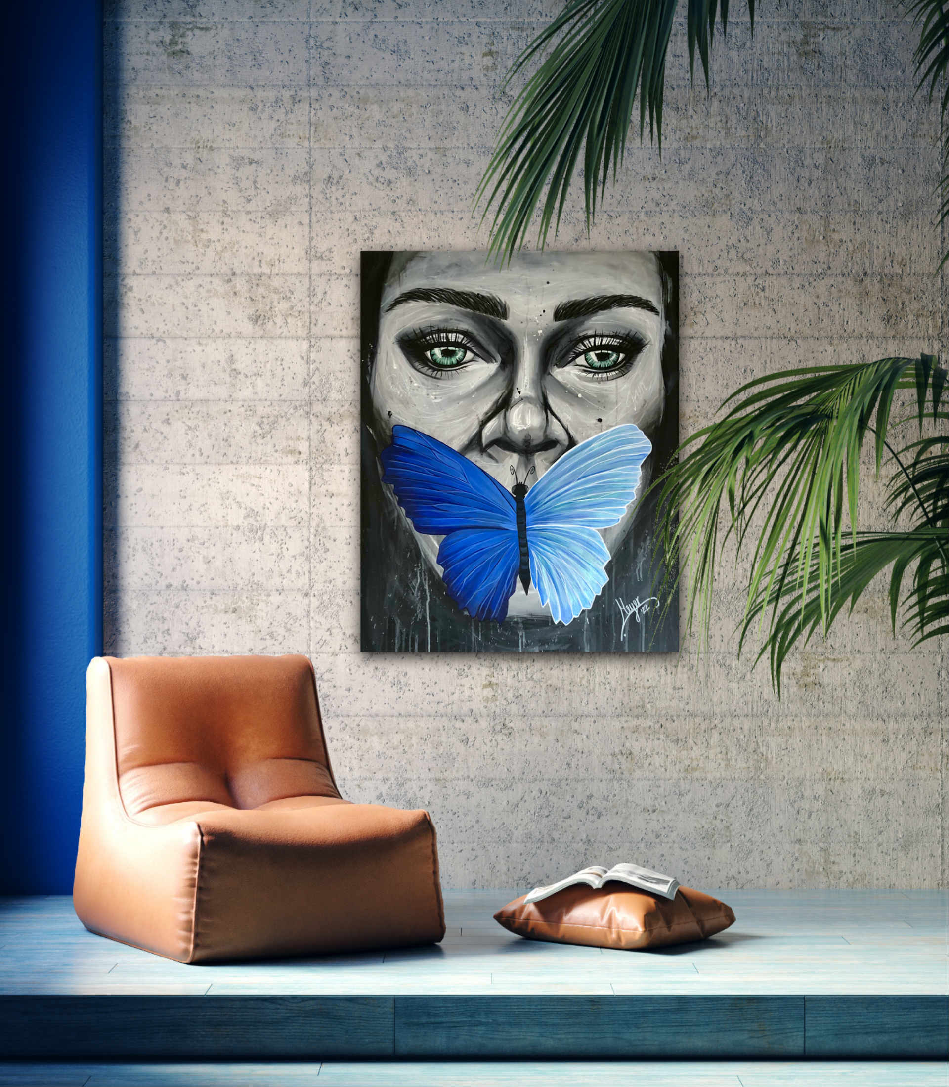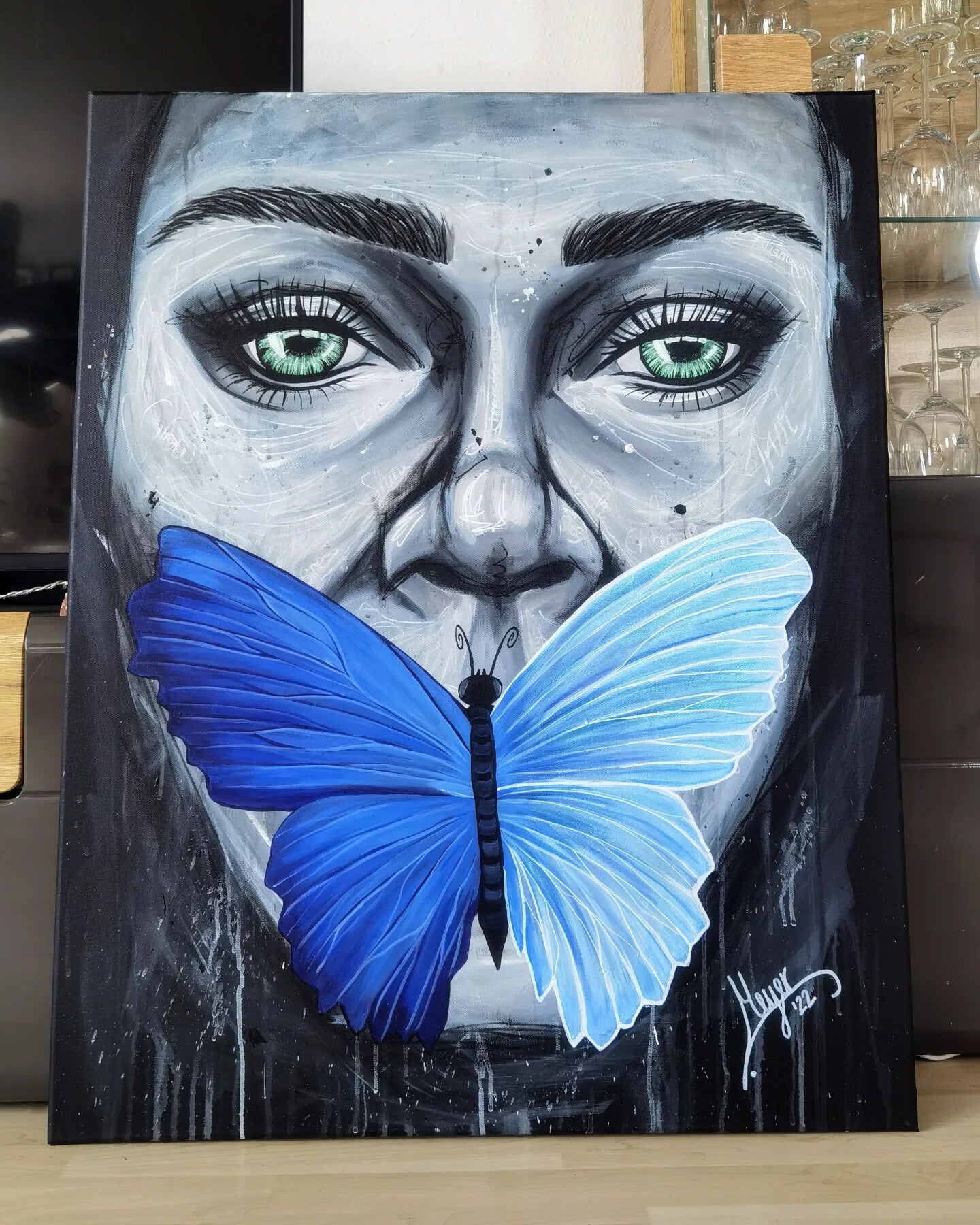 Das blau des Schmetterlings ist ein einzigartiger Blauton, welchen ich aus verschiedensten, kostenbaren Pigmenten selbst kreiert habe.