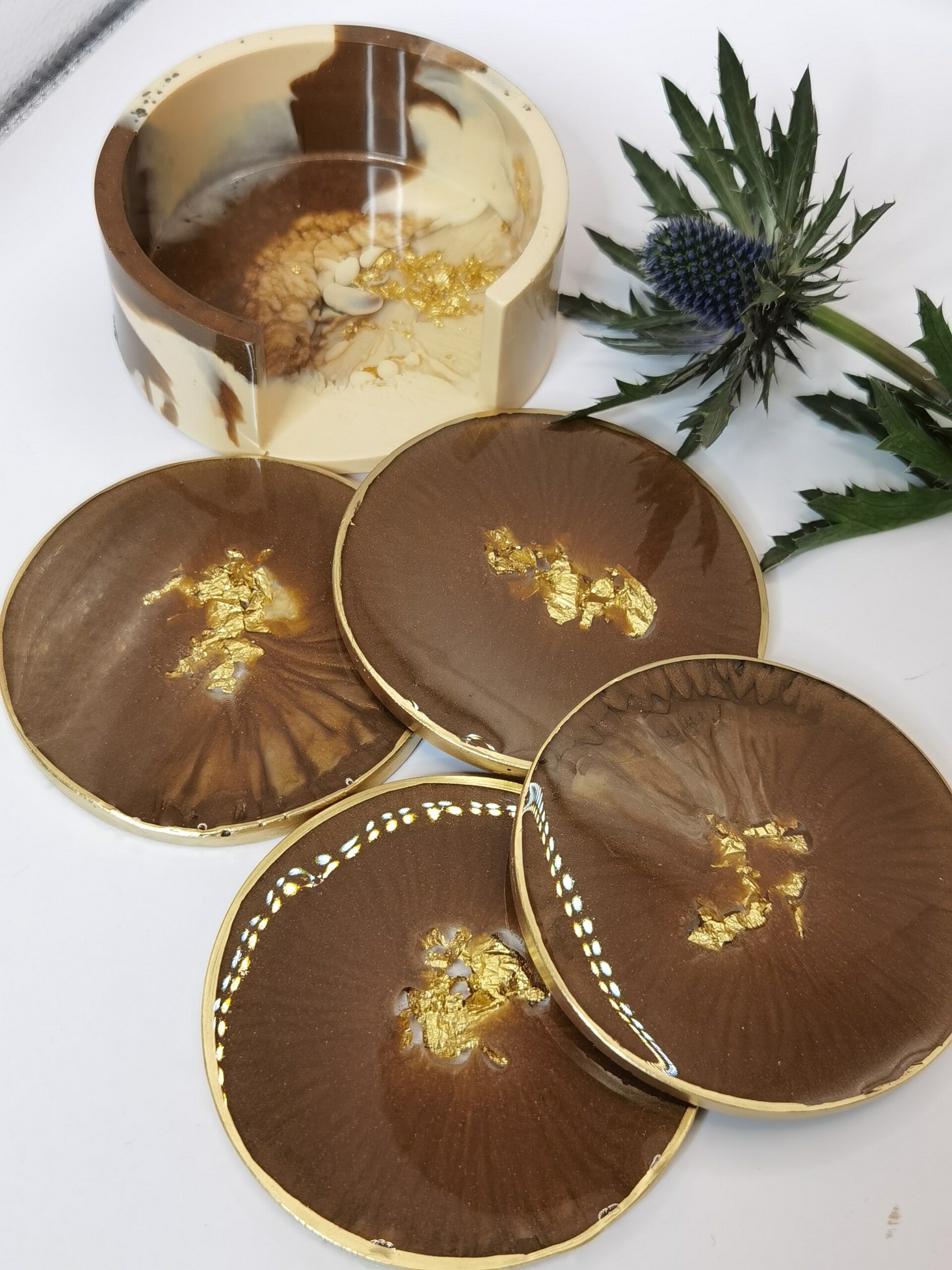 4er Set Untersetzer in braun/gold mit Aufbewahrungsschale